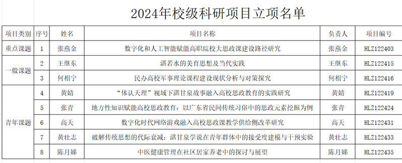 本次立項課題,聚焦學校高質(zhì)量發(fā)展、教育教學改革、服務文化強市等重要問題,涵蓋“數(shù)字化和人工智能賦能高職院校大思政課建設路徑研究”“湛若水思想文化影響”“廣東省民間傳統(tǒng)習俗中的思政元素”等方向,研究視域廣,選題角度新,研究方法多,兼具學術價值與實踐意義,可望催生出一批有價值的研究成果。