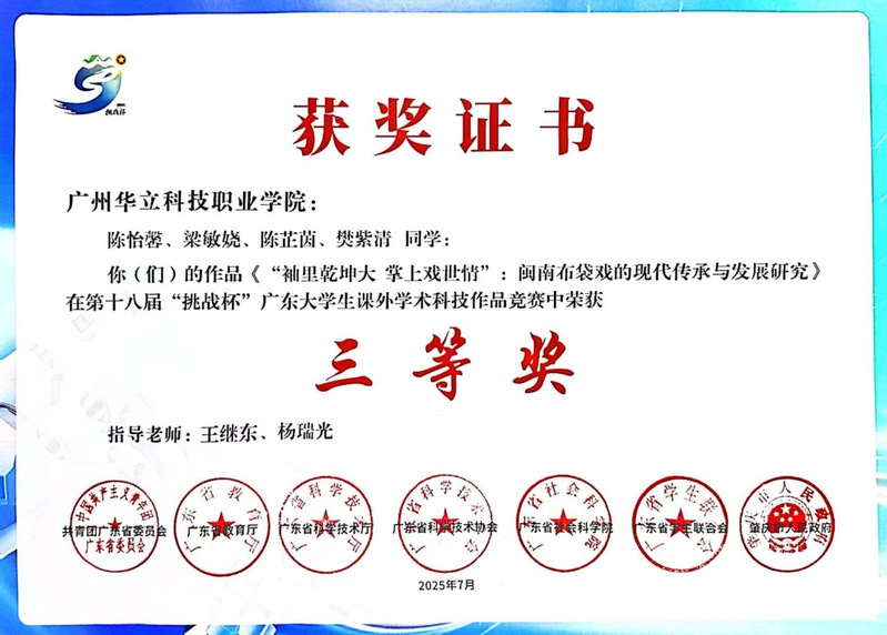 我院王繼東老師指導學生創(chuàng)作的作品《“袖里乾坤大 掌上戲曲情”:閩南布袋戲的現(xiàn)代傳承與發(fā)展研究》榮獲“第十八屆‘挑戰(zhàn)杯’廣東大學生課外學術(shù)科技作品競賽” 三等獎。