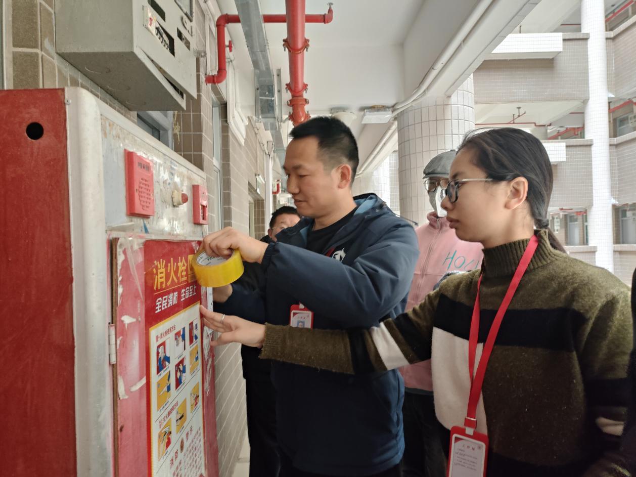 陳輝主任檢查學(xué)生走廊消防設(shè)備