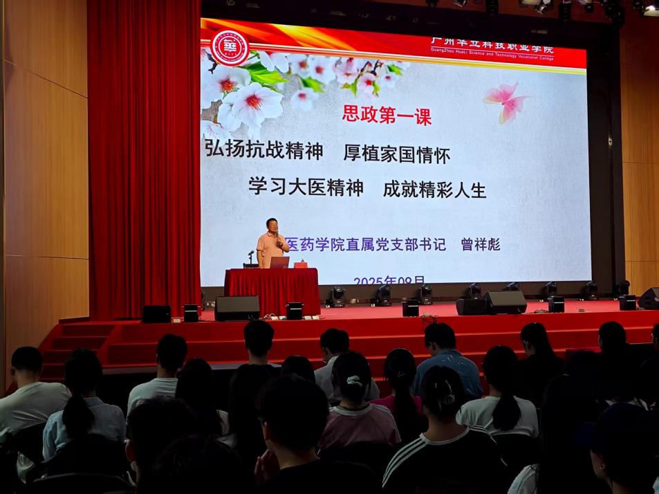 2025年9月11日下午,學(xué)院直屬黨支部書記曾祥彪在云浮校區(qū)文體樓8樓會議室以《弘揚抗戰(zhàn)精神,厚植家國情懷;學(xué)習(xí)大醫(yī)精神,成就精彩人生》為題,給360余名云浮校區(qū)中醫(yī)專業(yè)2025級生新講授思政第一課。學(xué)院副院長張志勇、陳耀輝及學(xué)院全體老師參加。