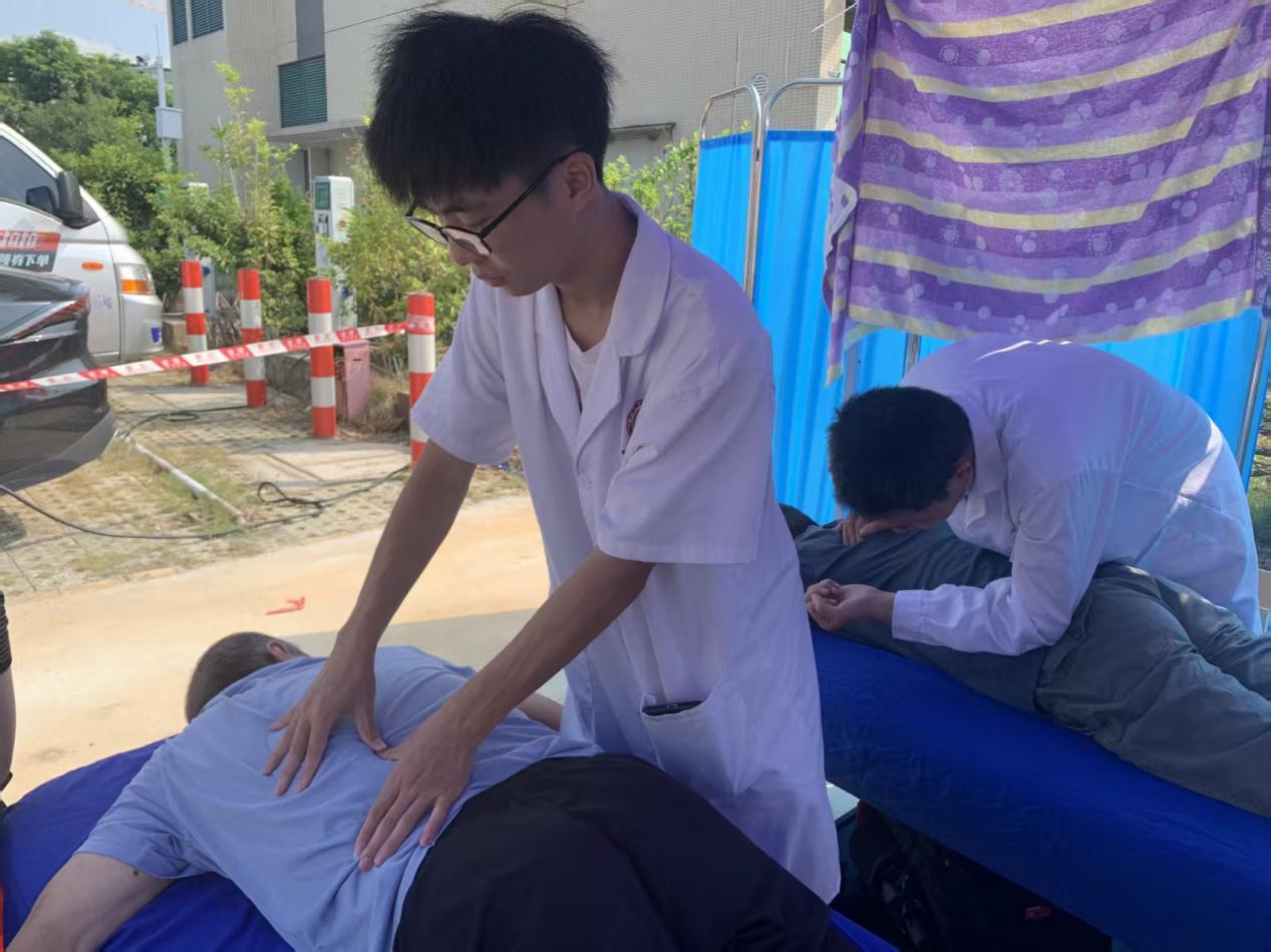 活動現場,醫(yī)療團隊以飽滿的熱情與專業(yè)的態(tài)度投入服務,迅速搭建起健康咨詢與理療服務專區(qū),吸引了眾多鄉(xiāng)鎮(zhèn)居民前來參與。潘菽弢博士憑借深厚的中醫(yī)理論功底與豐富的臨床經驗,為居民們提供一對一健康咨詢服務。與此同時,我院中醫(yī)藥應用研究所講師團與黨建小組的志愿者同學們充分發(fā)揮專業(yè)所長,為居民提供專業(yè)的推拿理療服務。面對患有頸肩腰腿痛的居民,志愿者們運用嫻熟的推拿手法,精準緩解肌肉緊張與疼痛,在服務過程中還向居民講解日常護腰、護頸的小技巧,幫助居民掌握自我保健方法。