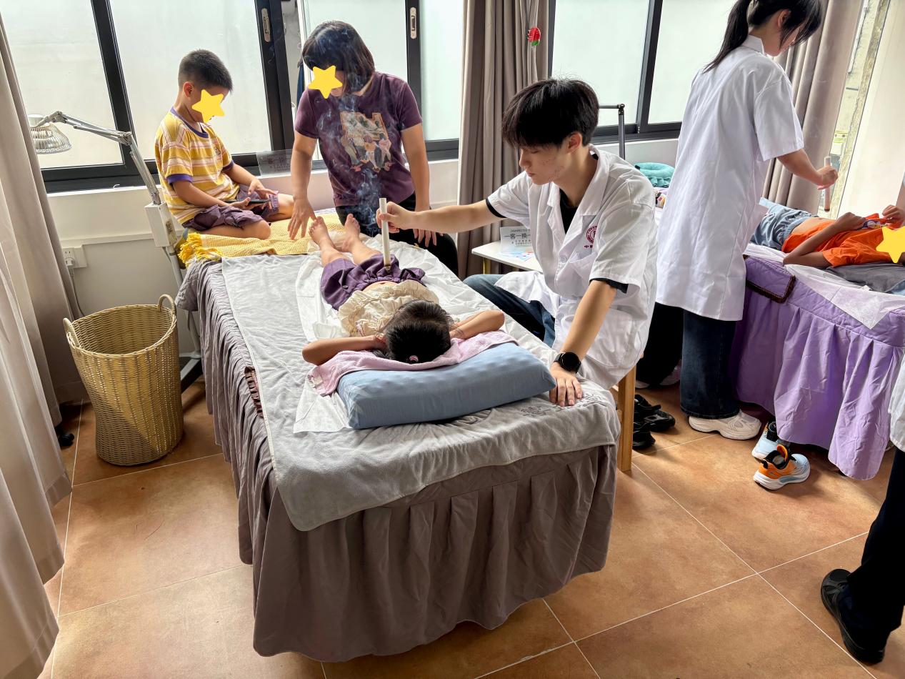 在隨后的治療環(huán)節(jié),艾灸與推拿等中醫(yī)外治法成為舒緩孩子身心的重要媒介。 根據(jù)前一輪診斷評估的結(jié)果,志愿者們“因人施術(shù)”,針對孩子們普遍存在的睡眠障礙、腸胃不適等問題,選取相應(yīng)的穴位和經(jīng)絡(luò),施展溫和的艾灸與推拿手法。當(dāng)清雅的艾草香氣在空氣中彌漫,當(dāng)志愿者們用溫暖的手掌輕柔地按摩孩子們的頭部、四肢及腹部,許多原本焦躁的孩子逐漸平靜下來。這些手法旨在調(diào)和氣血、放松神經(jīng),現(xiàn)場可以看到,一些孩子在接受按摩后,面部表情變得柔和,身體也不再緊繃。整個過程不僅是技術(shù)的施展,更是一場無聲的陪伴與療愈,讓抽象的“中醫(yī)”化為了可感、可知的溫暖觸摸。