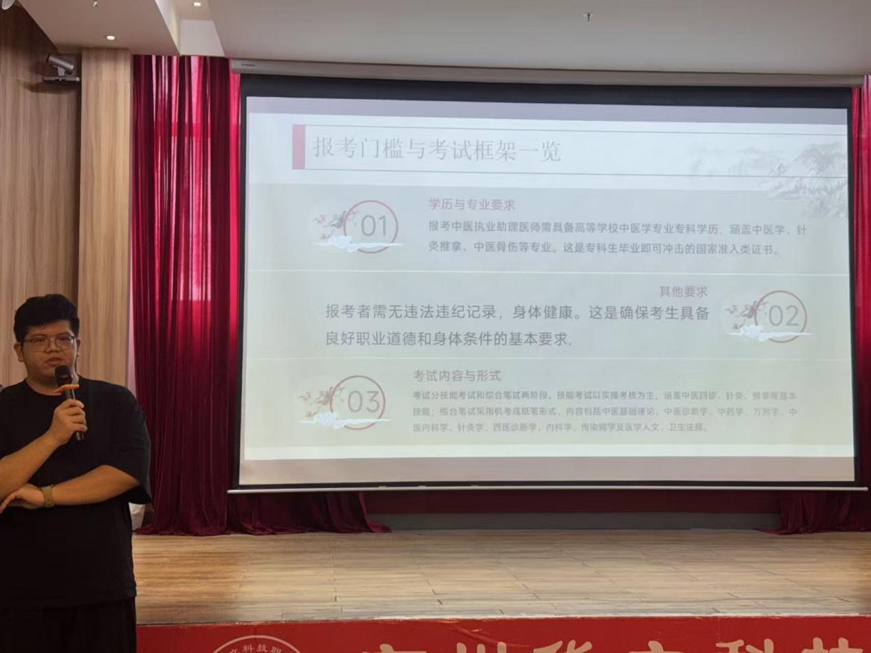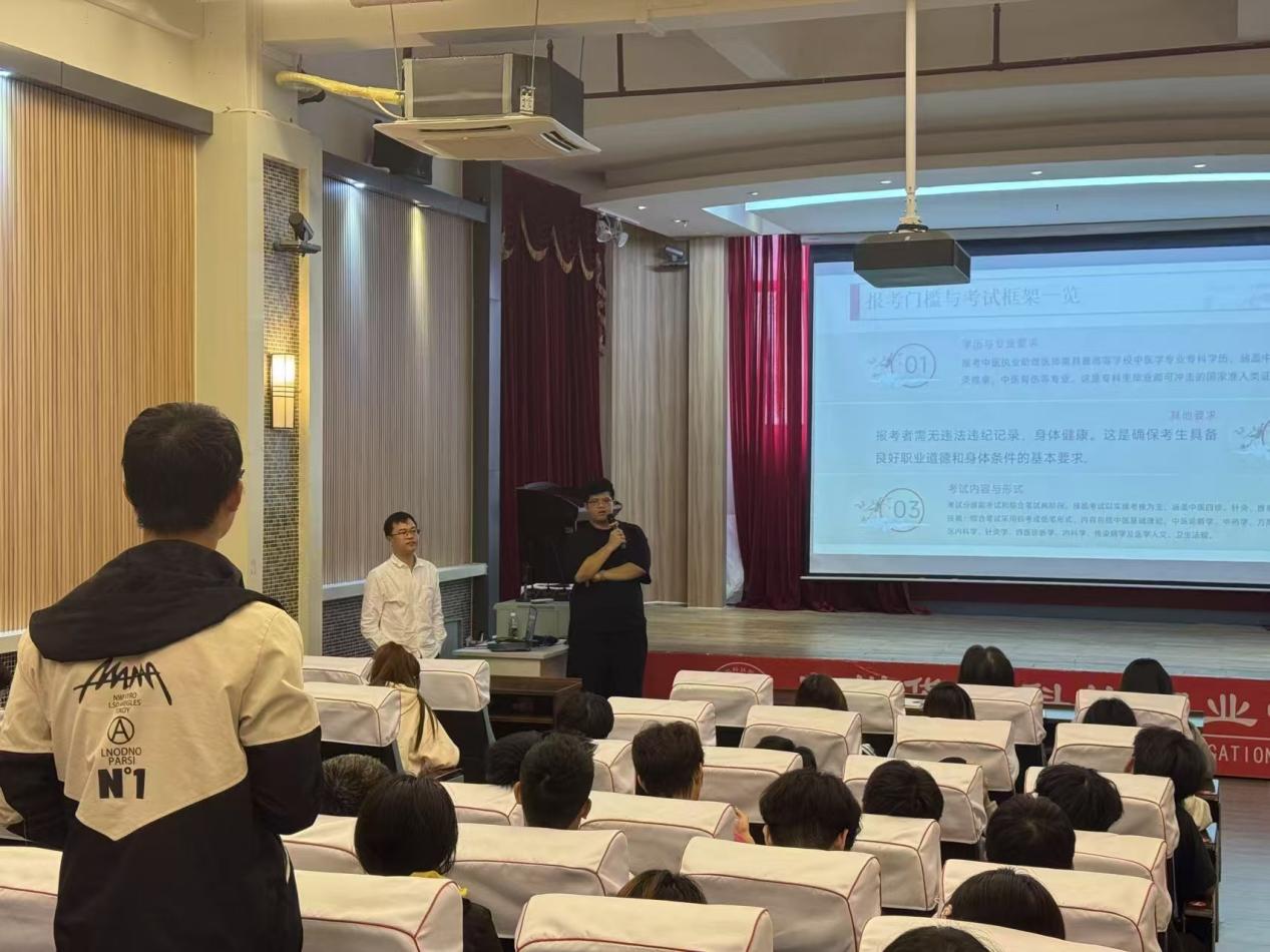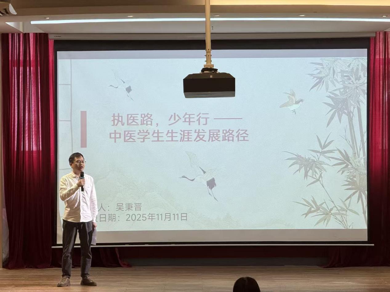 隨后,吳秉晉老師以“執(zhí)醫(yī)路,少年行”為主題開展專題分享。吳老師結(jié)合自身經(jīng)歷,從中醫(yī)藥行業(yè)就業(yè)現(xiàn)狀、職業(yè)發(fā)展方向、專業(yè)學(xué)習(xí)、升學(xué)以及考證等多個(gè)維度為同學(xué)們進(jìn)行了系統(tǒng)講解,還針對(duì)同學(xué)們普遍關(guān)心的職業(yè)選擇困惑、能力提升重點(diǎn)等問(wèn)題給出了具體建議。