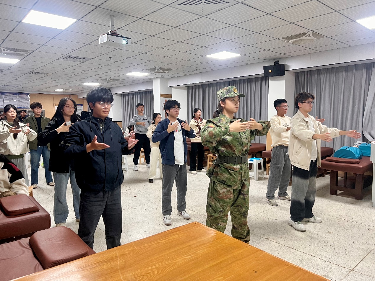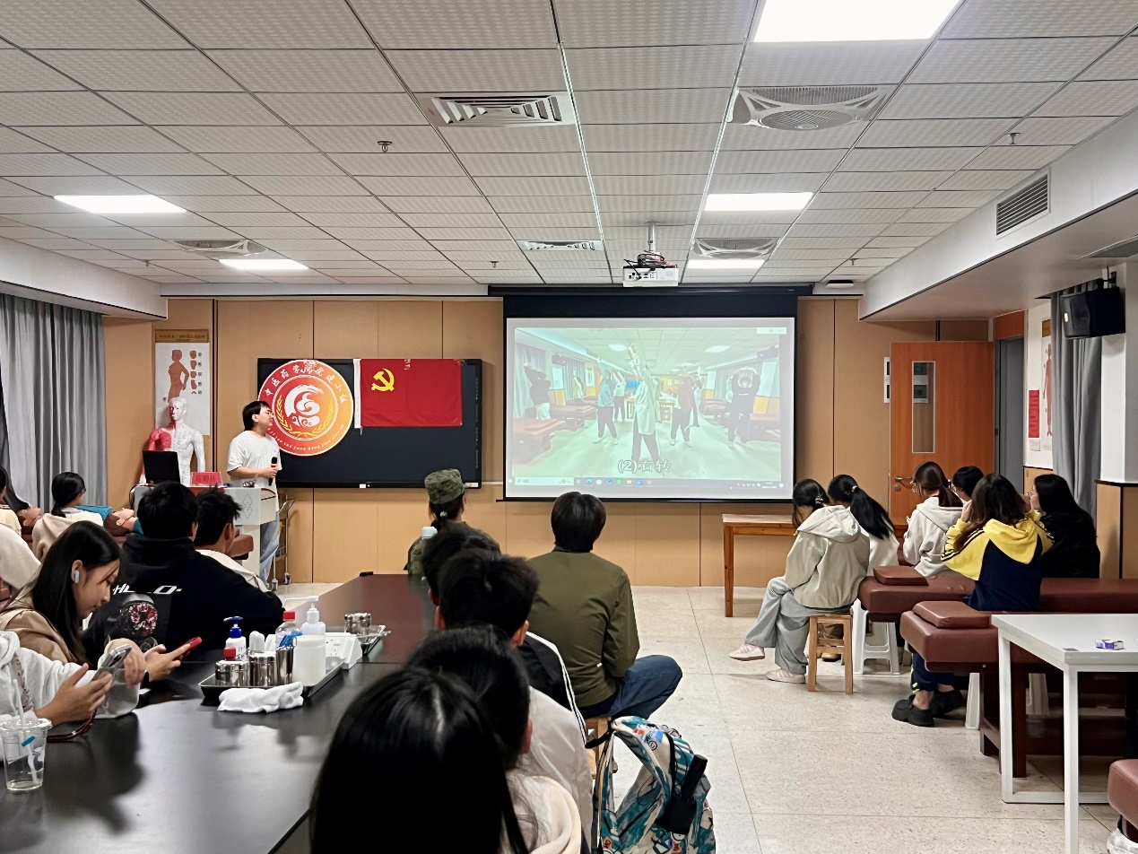 隨后,現(xiàn)場(chǎng)播放了由中醫(yī)藥應(yīng)用研究所講師團(tuán)精心錄制的導(dǎo)引動(dòng)作教學(xué)視頻,系統(tǒng)展示了多個(gè)針對(duì)頸、胸、腰椎的經(jīng)典導(dǎo)引姿勢(shì),包括八段錦中關(guān)于脊柱保健的精華招式,視頻詳細(xì)的要領(lǐng)講解,確保每個(gè)動(dòng)作細(xì)節(jié)都能清晰呈現(xiàn)。在觀看過程中,同學(xué)們?nèi)褙炞?,這段教學(xué)視頻不僅再現(xiàn)了標(biāo)準(zhǔn)動(dòng)作,將古老的導(dǎo)引術(shù)以現(xiàn)代化方式呈現(xiàn),為接下來的實(shí)操環(huán)節(jié)提供了直觀的參考依據(jù),讓學(xué)生們能夠更快地掌握動(dòng)作要領(lǐng)。在講師和黨建小組工作人員的引導(dǎo)下,學(xué)生們分為若干小組,開展現(xiàn)場(chǎng)實(shí)操訓(xùn)練,大家互相糾正動(dòng)作、講師團(tuán)成員巡回指導(dǎo),確保動(dòng)作規(guī)范,不少同學(xué)表示“做完一套動(dòng)作,肩頸輕松了許多”。